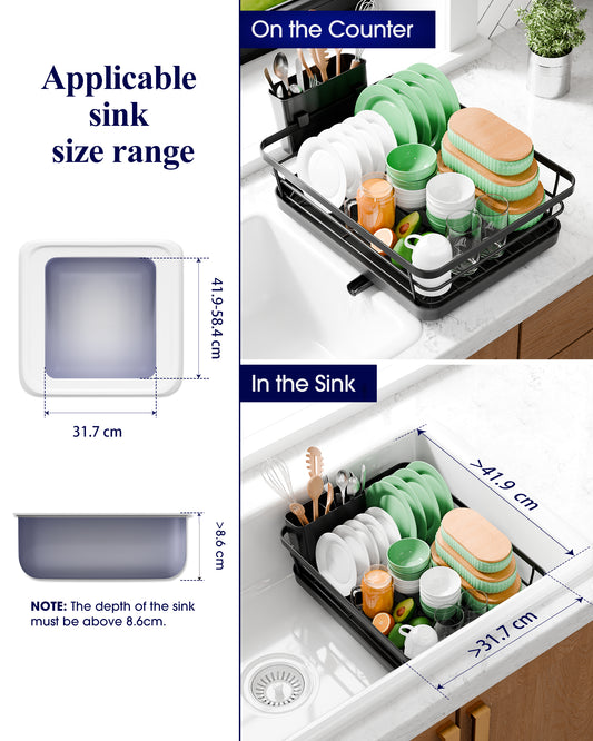 Kitsure Dish Drying Rack - Compact Dish Rack with Utensil Holder & Adjustable Water Outlet, Rust-Proof & Scratch-Resistant Drying Rack for Kitchen, 15.5" x 12.0" x 5.0", Black