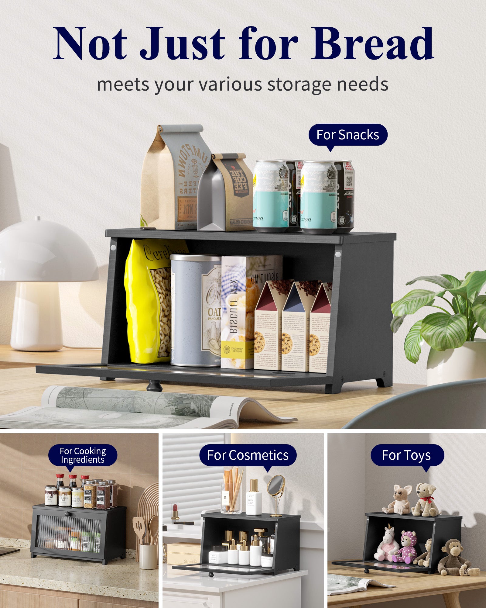 Kitsure Bread Box - Wooden Bread Box for Kitchen Countertop, Large Capacity Kitchen Countertop Organizer, Stylish Bread Storage with Window, Multi-functional Container, Black, 15.0"x8.3"x9.1" (1T)